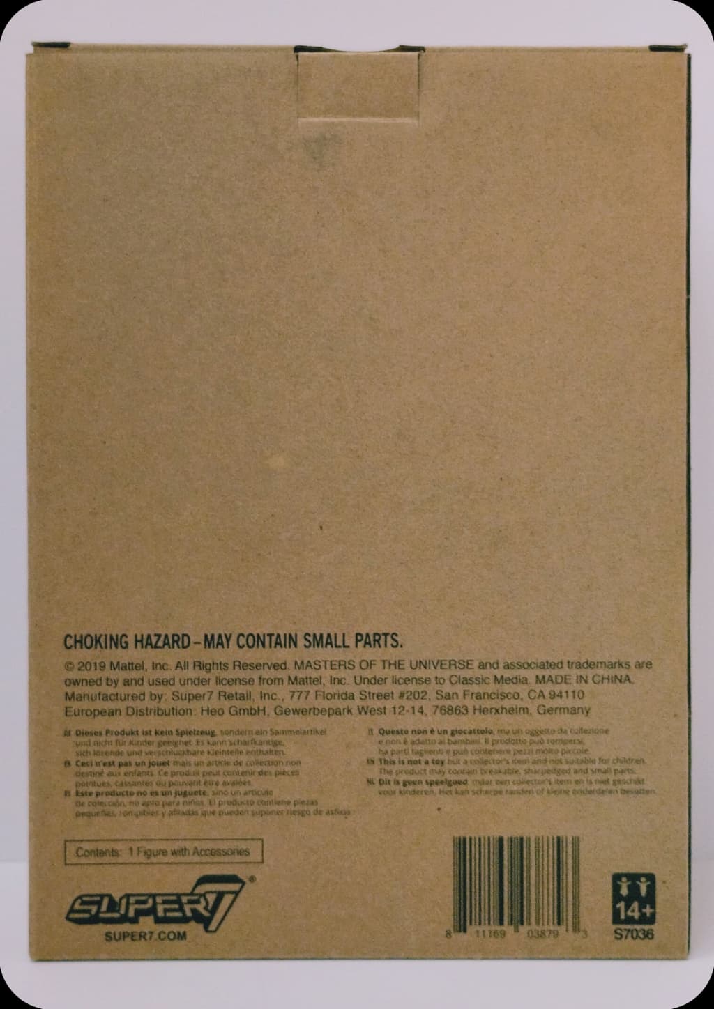 Produto: Em 2019, a Super7, licenciada pela Mattel, lança a linha de figuras do filme de 1987, Masters Of The Universe: The Motion Picture. Há escala dos Classics, esta figura de 16/17 cm de altura, com vários pontos de articulação, foi fielmente produzida à semelhança de Skeletor, interpretado por Frank Langella. Contém também vários acessórios.